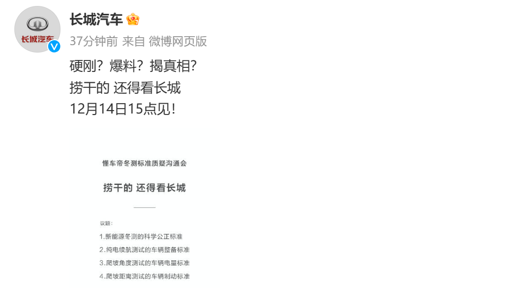 在此经过中有十余次开关车门、车窗的操作,其中最长技巧逾越3分钟,大大加多了空调能耗,导致电量快速下跌。在严寒极限及空调捏续制热条目下,屡次长技巧开车窗、车门,严重背离用户信得过使用场景。 皇冠客服飞机:@seo3687另外,在车辆电量仅剩74.9%欧博体育,搭载驾驶员及4个60公斤沙袋的情况下才运转测试,到电量为20.4%时增程器运转启动,骨子挥霍电板电量54.5%。 长城汽车发声 www.bettingroyalhome.com此外,12月11日,长城汽车官博也晓谕,将于12月14日15时在北京举行懂车帝冬测花式质疑相易会。 皇冠体育一直以来都是博彩行业的领军品牌,其拥有的博彩游戏类型和优质的服务,备受博彩爱好者的青睐。此外,皇冠体育还积极参与体育赛事赞助,不断推陈出新,为博彩市场注入了新的活力。长城汽车官博称:硬刚?爆料?揭真相?捞干的,还得看长城,12月14日15点见! 议题: 1、新动力冬测的科学平正花式