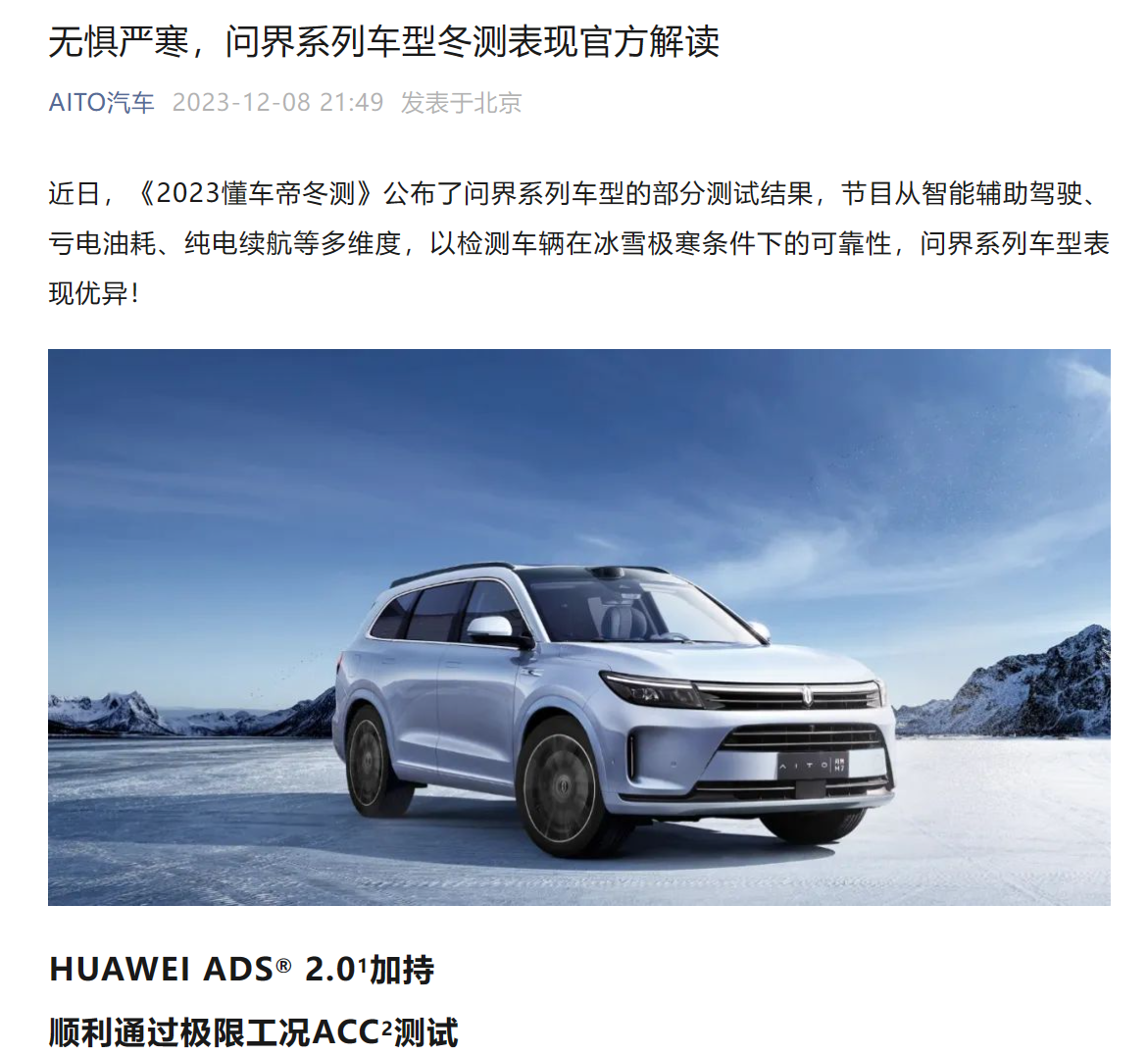 起原:逐日经济新闻欧博体育 每经剪辑:李泽东 近日,懂车帝发布《2023懂车帝冬测》,测试了严寒情况下的混动车型纯电续航完结率,约20个车型进入测试。其中,比亚迪仰望以85.08%的续航完结率名秩序一,问界M7增程版以31.6%的续航完结率名次倒数第一。 据证券时报,关于该测试成果,华为智能汽车搞定有缱绻BU(以下简称“车BU”)董事长余承东发文称:“坑东谈主的测试,误导众人!科学与严谨才是应该效能的基本规则!” 皇冠hg86a12月8日晚,AITO汽车官微发布《无惧严寒,问界系列车型冬测发扬官方解读》,酬金问界新M7在某媒体冬测中插混组纯电续航完结率名次垫底一事。 著述称,在该媒体公布的“插混组支援WLTC4花式纯电续航完结率”成果表现,问界新M7的纯电续航为55.3公里。AITO汽车暗示,经测试媒体证实,车辆在认真测试前进行了计较71分钟的空调制热,在车内温度达到24摄氏度后,又捏续制热40分钟。